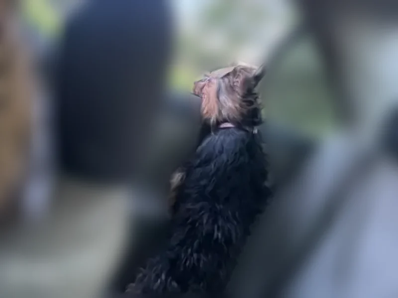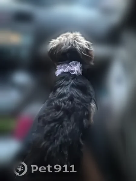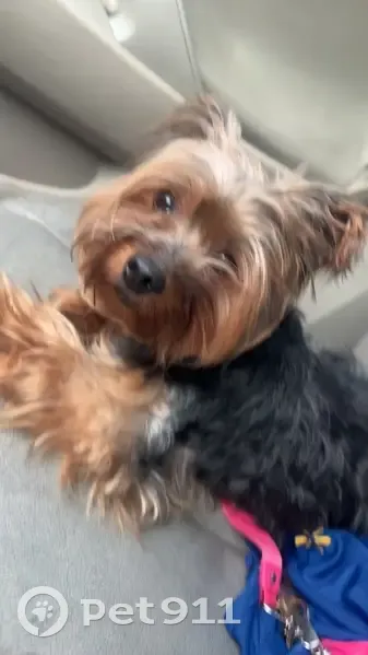 She very friendly she’s brown and black her face is mostly brown , she comes to squeaky toy noise , she does not bite or attack , we were involved in a car accident and she flew out of the window she has a pink collar on !