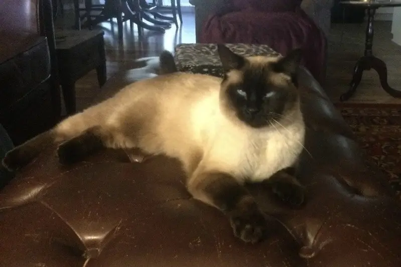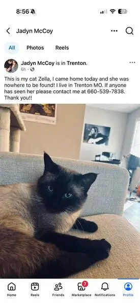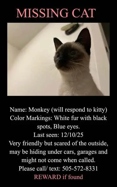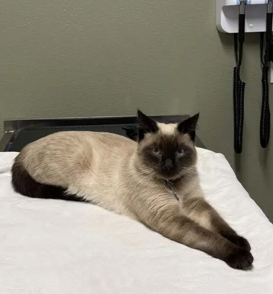 Siamese kitten - female - approximately 4 months old. Black face, mostly white body, blue eyes. We found her in the woods near the old Highland Drive Elementary property.