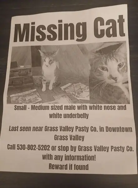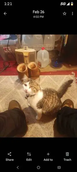 Extremely sweet little cat. She was trying to get into my apartment building. Tabby striped back and tail, white legs and belly.