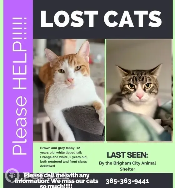 Please help us find our missing cats!!!! Batman: brown/grey/black/white tabby, male, neutered, front paws declawed, white tipped tail, 12 years old. Last seen in Brigham city. Please call me with any information!! Thank you! 385-363-9441