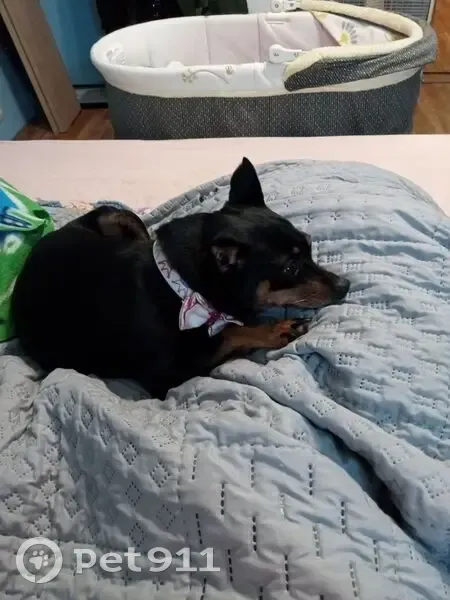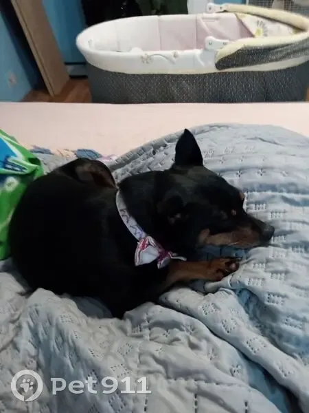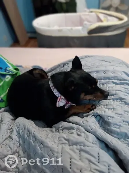 Black and Tan Patch of White hair Under Chin pink crowed pattern Collar fat 8 to 10 lbs shy to strangers was let out of house between 6:00 and 6:15 was last seen running circles around hose