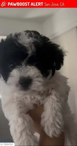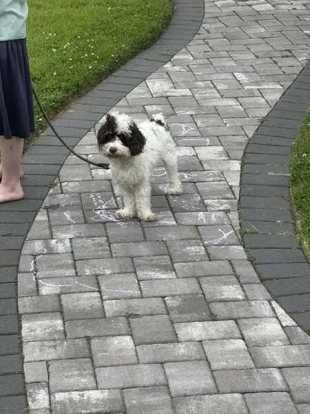 Small black and white dog with curly fur. The dog appears to be a small breed mix (possibly Shih Tzu / Havanese type). Mostly white body with black ears and black facial markings, including Underbite front bottom tooth. Green harness.