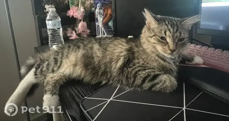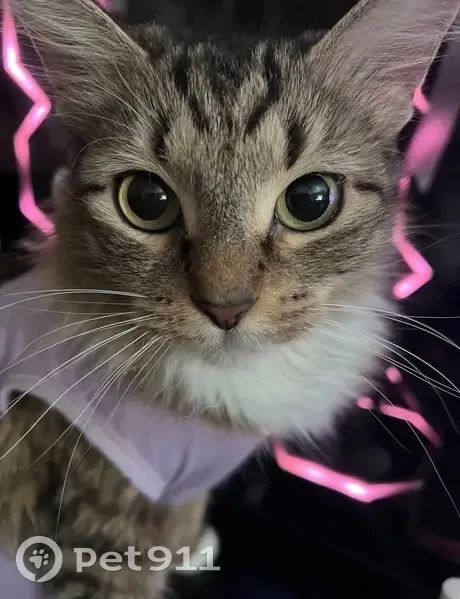 She is a medium haired tabby cat (brown/black/tan colors) with a white under belly, and white paws, her lips are also black so sometimes it looks like her mouth is open but its not, she’s also very skittish with people