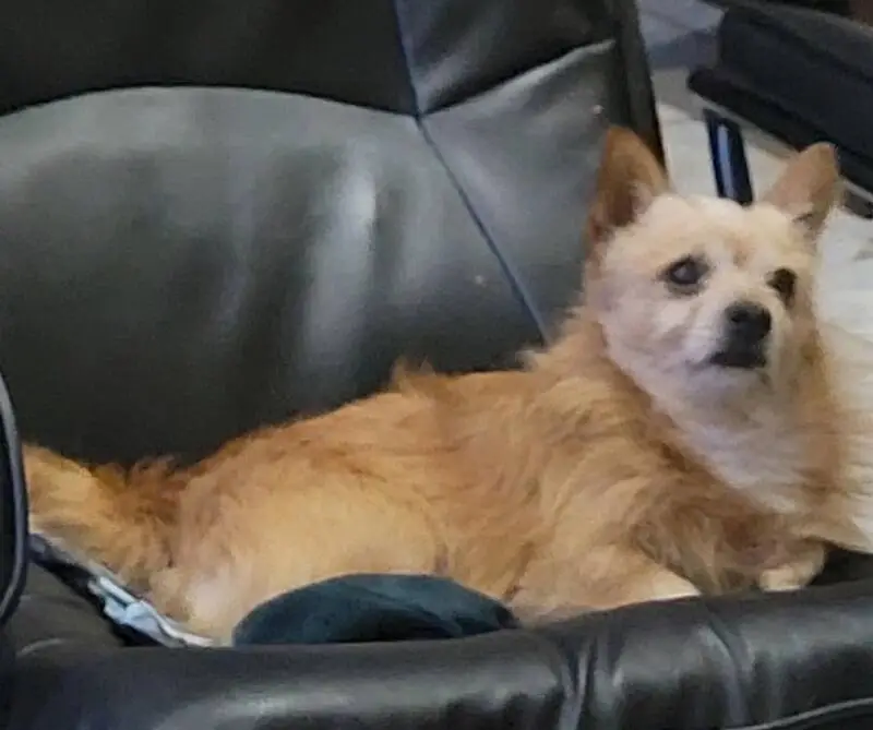 The dog has a light tan or cream coat with white fur around its face, neck, and chest. It has a fluffy and slightly wavy coat. She's very friendly and loves belly rubs. She twirls when she's excited or getting fed.