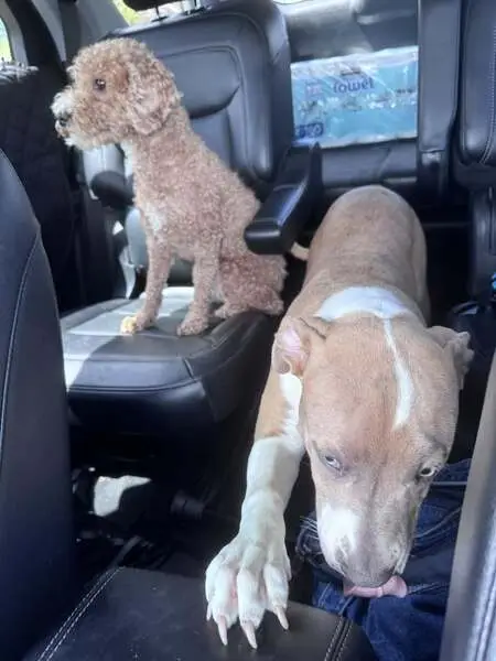 He’s a red nose pit bull he’s got one blue eye & a green eye. He has a few scars from another dog attacking him a few months back he’s my sweet baby boy