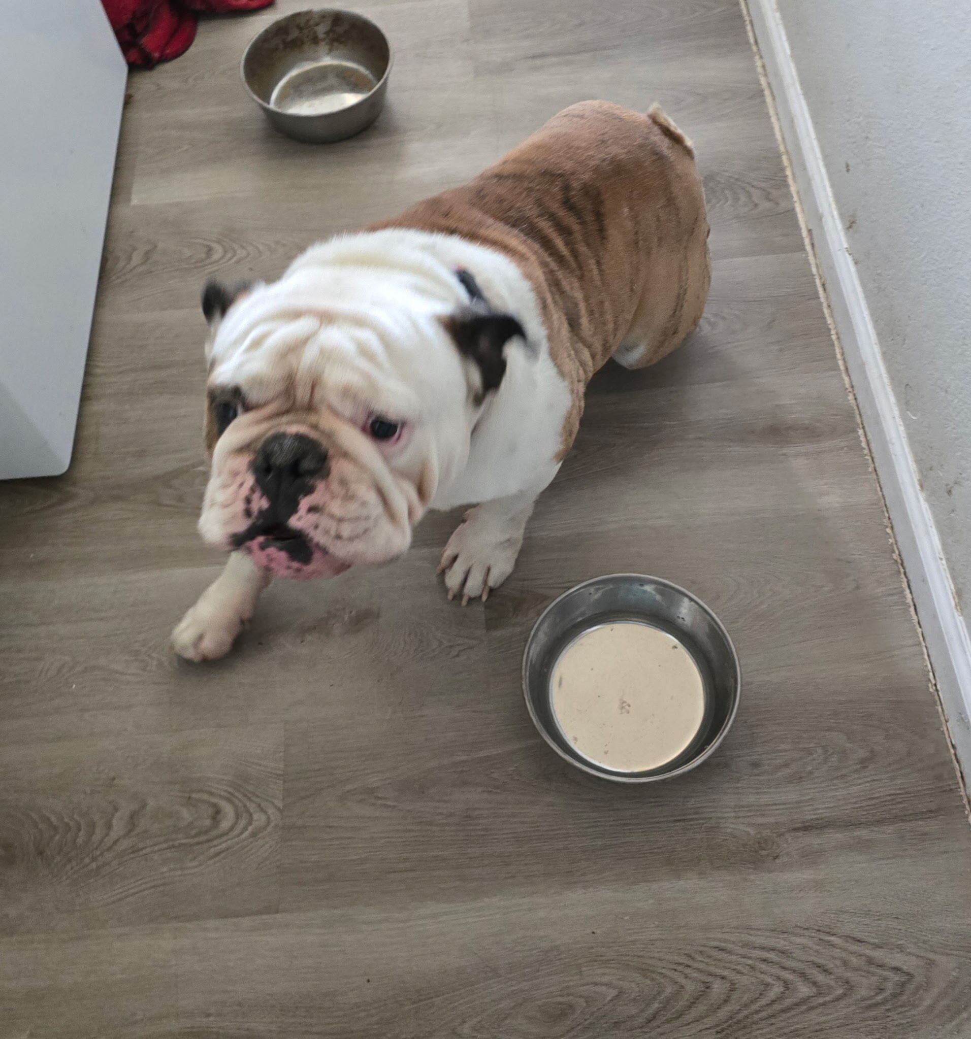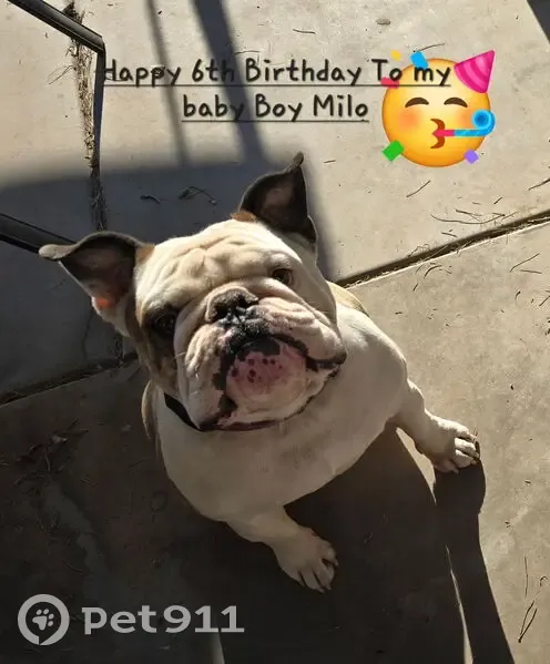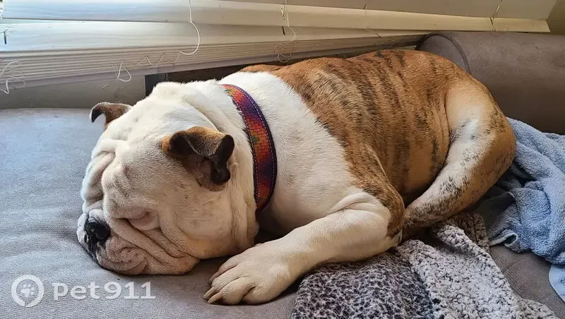 Brown with white and tiger stripes, has a really small tail and a small bold part in his tail, he doesn’t wagged his tail since he had his tail surgery. He was taking when he was walking in the alley behind my house, when my sister went to get him, a black Nissan Altima that was driving through the alley him him.