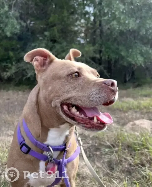 Yellow & White mixed Breed around 65 lbs micro chipped very friendly was thrown from an auto accident I 45 S. Buffalo Texas close to Hwy 79 Purple harness & collar