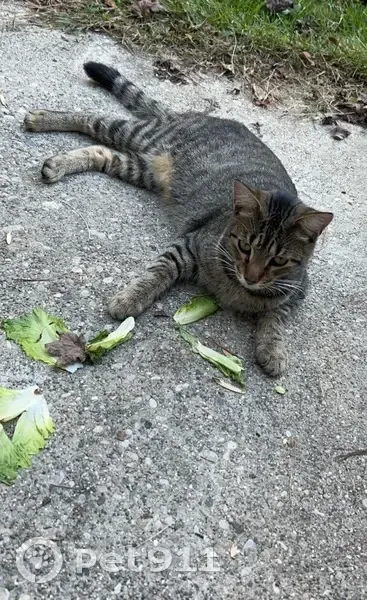Dark grey with black stripes Was wearing a green collar with nametag when he disappeared Neutered, approximately 2 years old