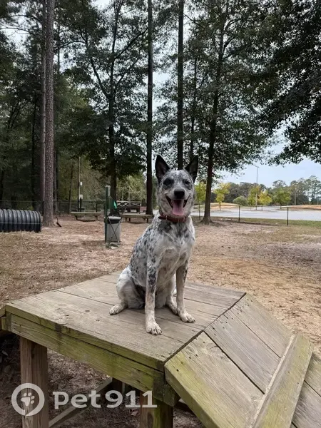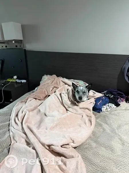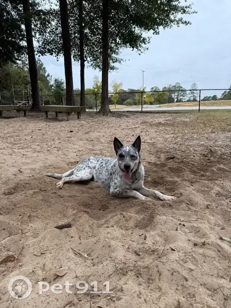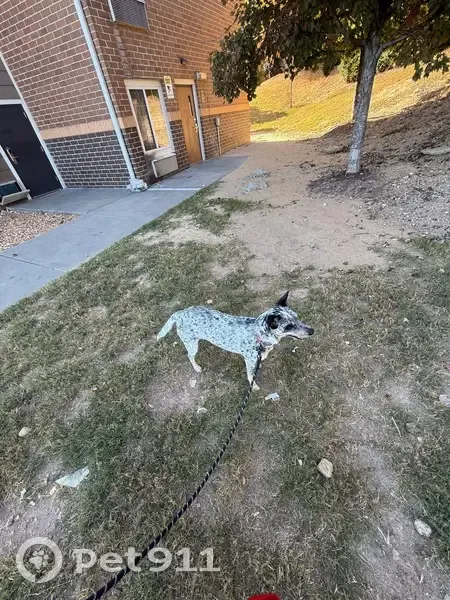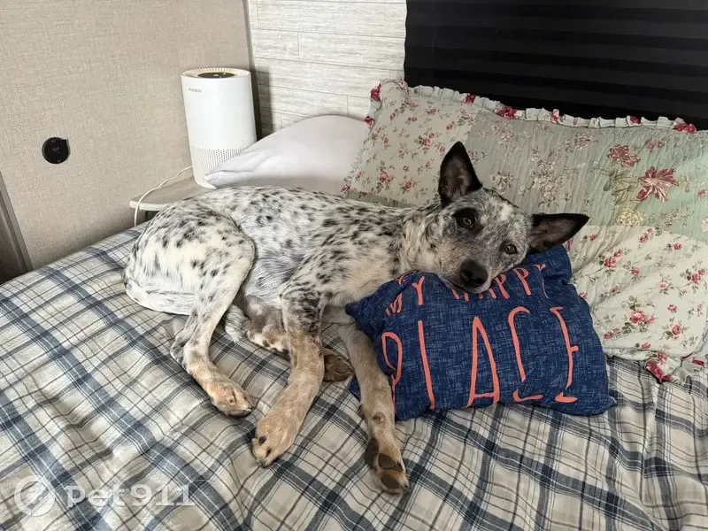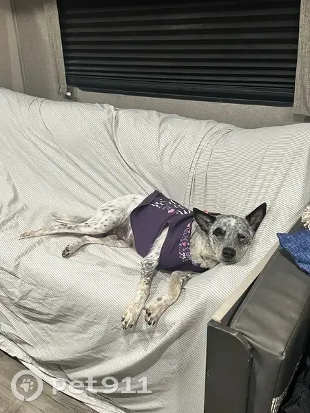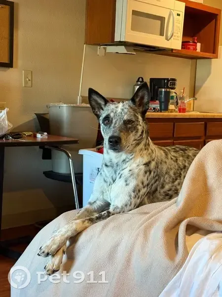 Speckled blue heeler. She didn’t have a collar since she was at home in crate while i was gone. Curved tail ending and is shy around others. Pointed about with smaller sized head. She has a black right patch on her eye.