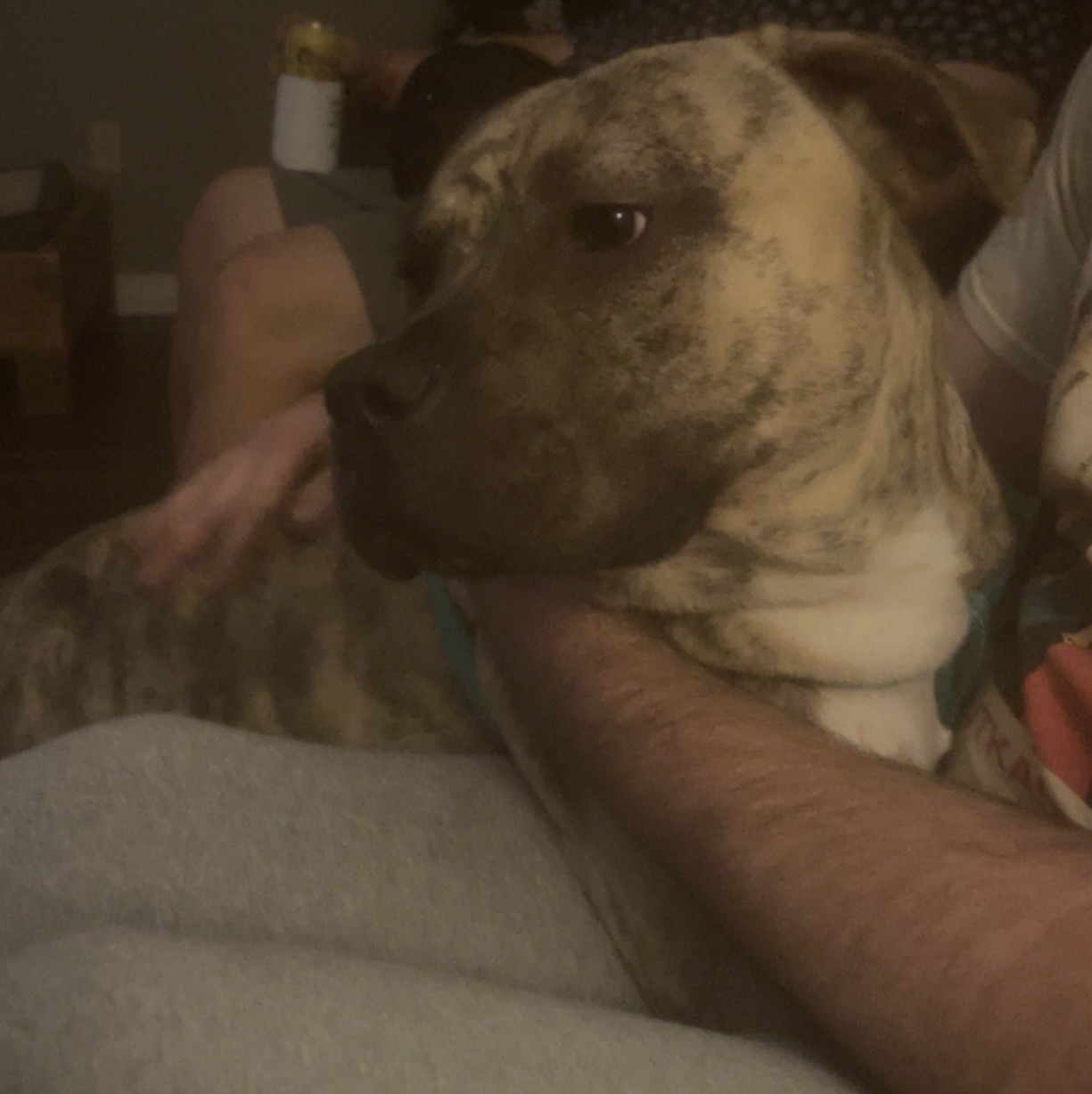 Grey/brindle. Possibly had puppies in the las...
