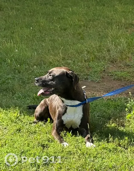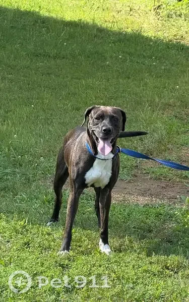 Brindle Color. Dark Brown, looks black in low light and when dirty. Chest and throat are white. White on paws centralized around toes except front left paw has more white than the others. Very friendly. Anxious and terrified of everything. She slipped out the front door. First time ever escaping.