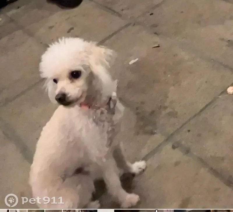 White and has a bit of tan on her back. She’s wearing a colar with flowers printed on it. She’s small 7-8 year old Poodle mixed Maltese. It appeared she got out of the fence or someone grabbed her from the fence since there was a hole made .