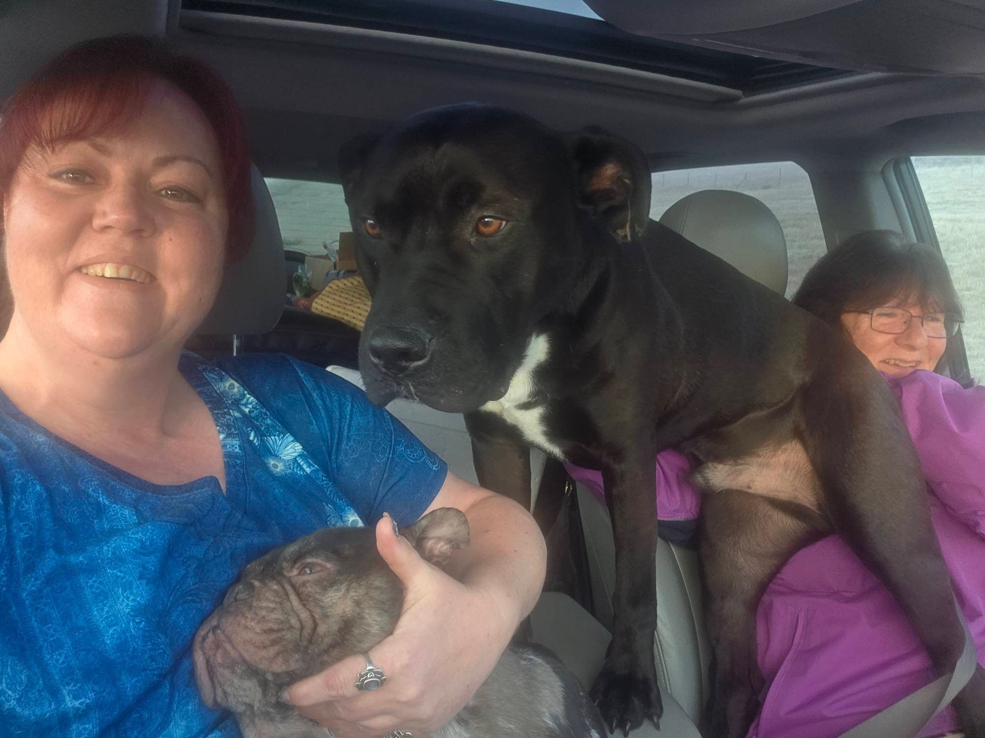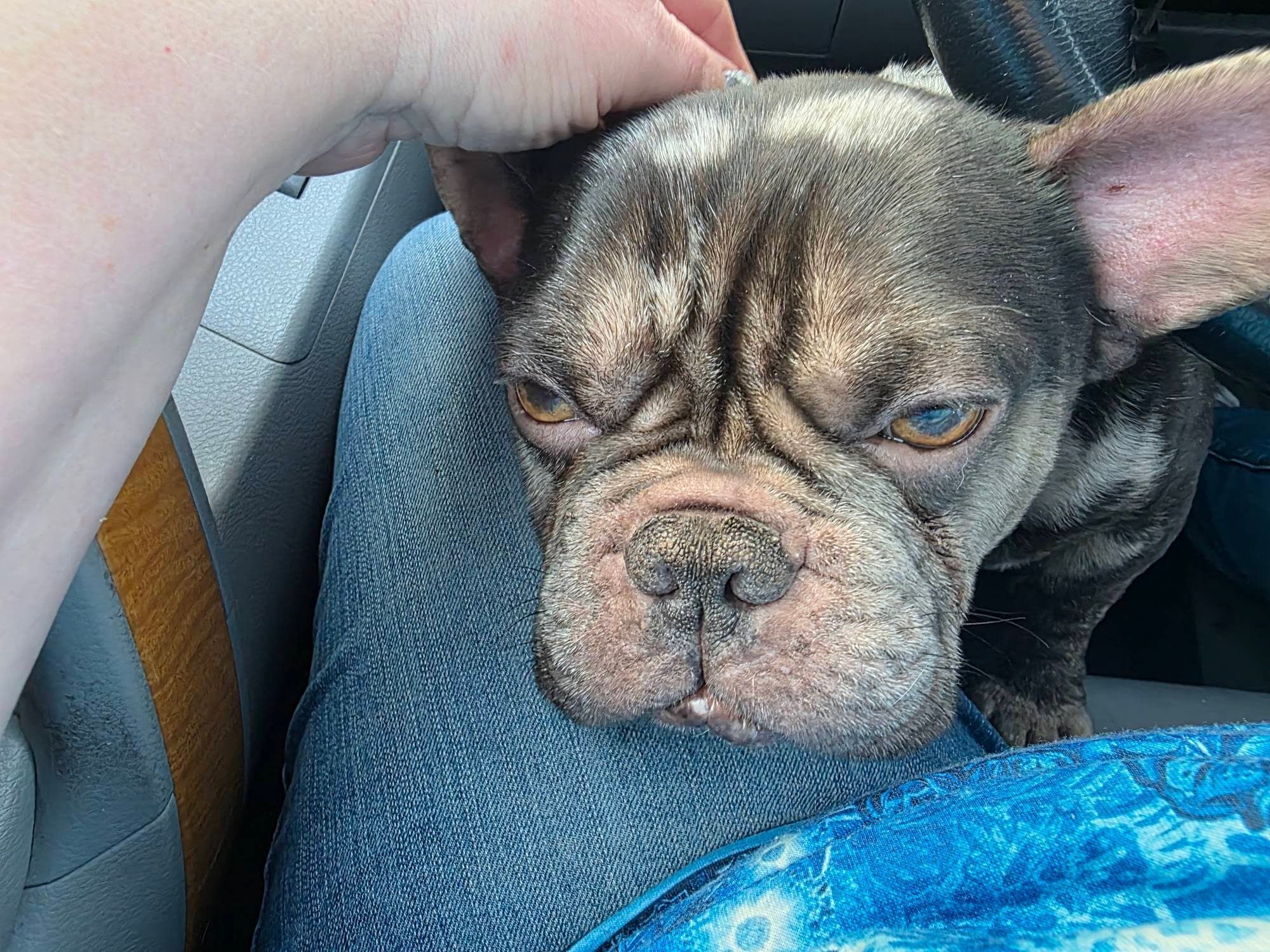 First dog is a black pit and the other is a multi color black gray Frenchie. Very friendly. Found in California running across I5 half a mile past the border of Oregon. They were handed over to a California state trooper.