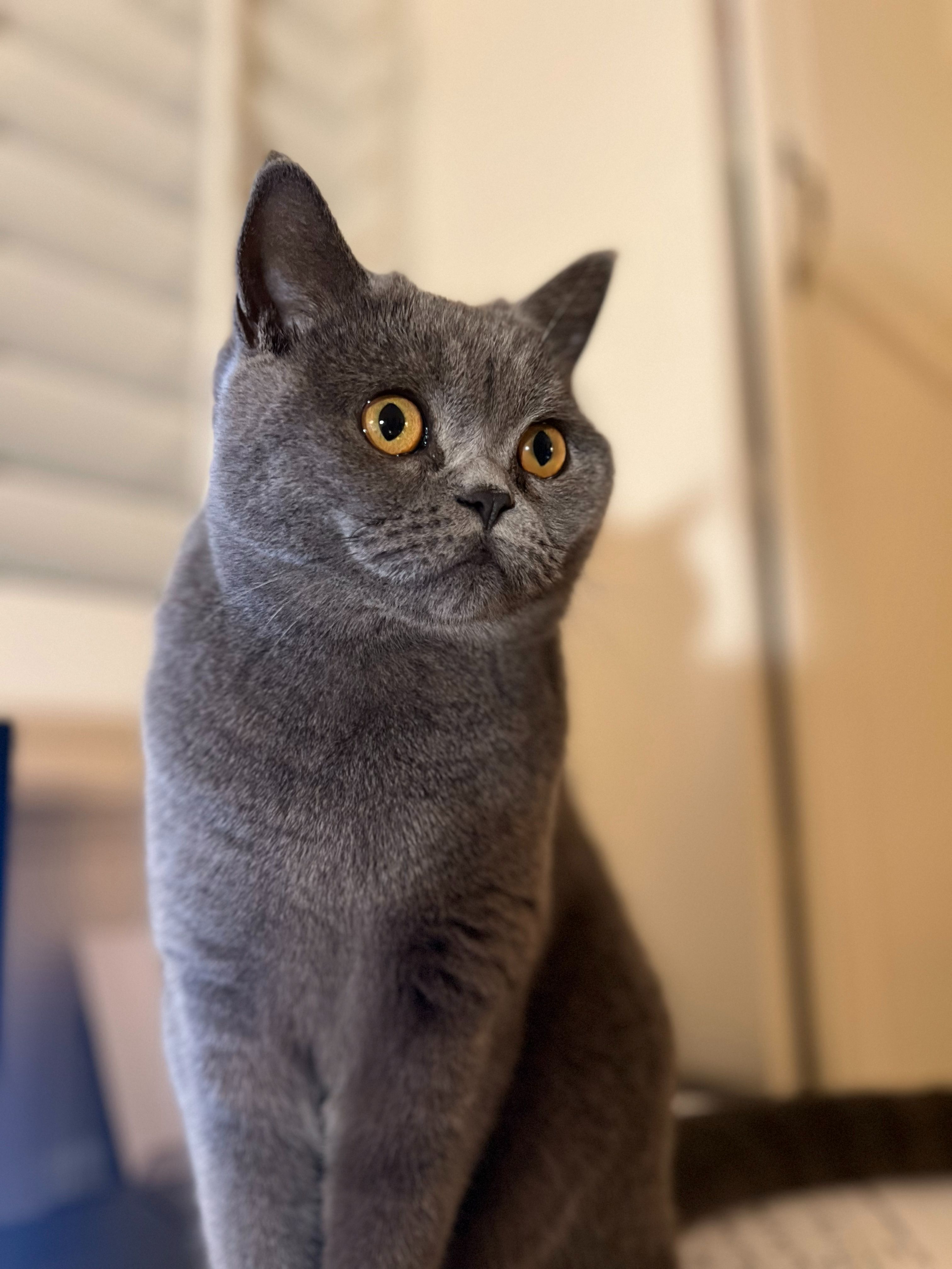 • Solid gray (blue) coat • Large round amber...