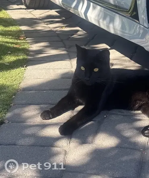 Maverick is a black male cat with yellow eyes and was last seen wearing a red reflective collar. He's very friendly and may have wandered into a garage or shed.
