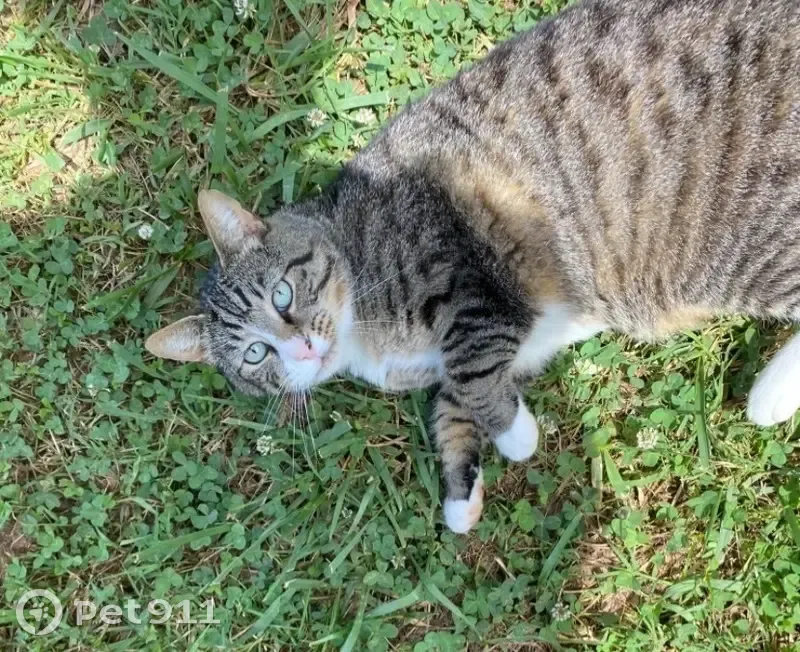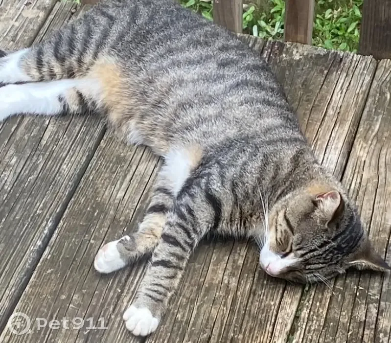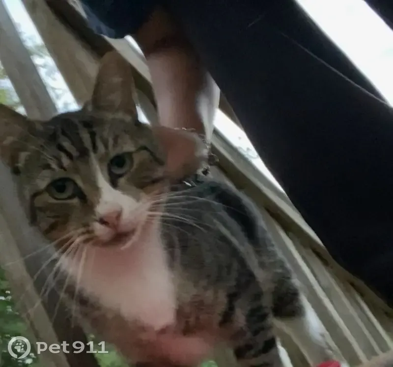 Tabby (black, white, brown, gray) male with pink nose, white paws, white chest. 3 years old, neutered and micro chipped. I have reason to believe he was trapped by the neighbor. Could be with two black kitties. Very talkative and friendly but does not like to be held.