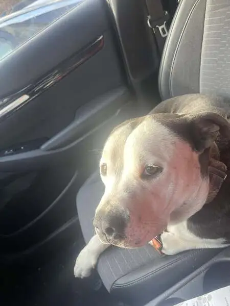This dog was walking along long Rd and had just reached winding path when I was in a car about to turn and several cars were stopping trying not to hit it. It is brown marble color with white on its neck and a red collar with no tags and no ring to put a leash on the collar. He is quite friendly and I went to homes in the neighborhood just behind long Rd and knocked on doors to see if anyone recognized him but no one did. I just didn't want him to get hit since one of my dogs passed in April and I wouldn't want another owner to go through this grief. So I have him and will happily return him.