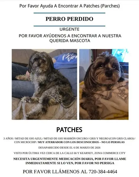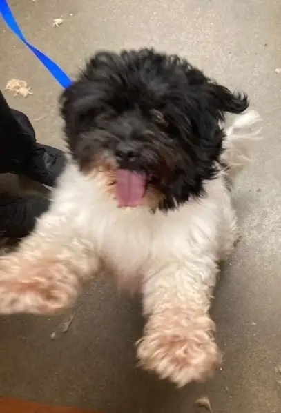 Black and white female Shih Tzu. Approximately 8yo. Serious eye ulcers, cherries, and kcs. Emergency medical attention was required.
