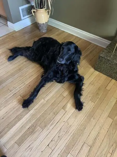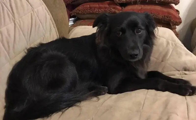 Black with short/medium length fur. About 40 pounds. Female. Seems like she has had puppies before. Very well behaved. She has some distinct characteristics that I will keep private to avoid scammers.