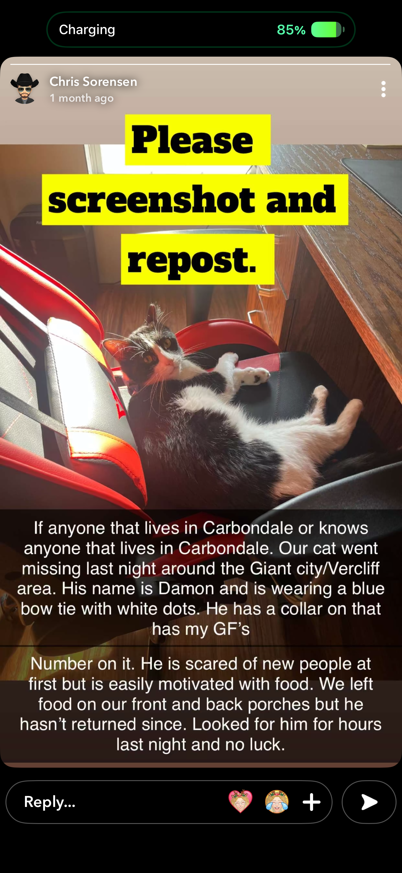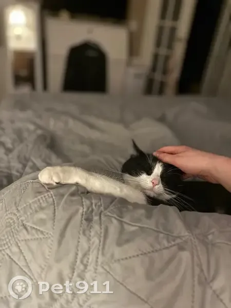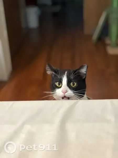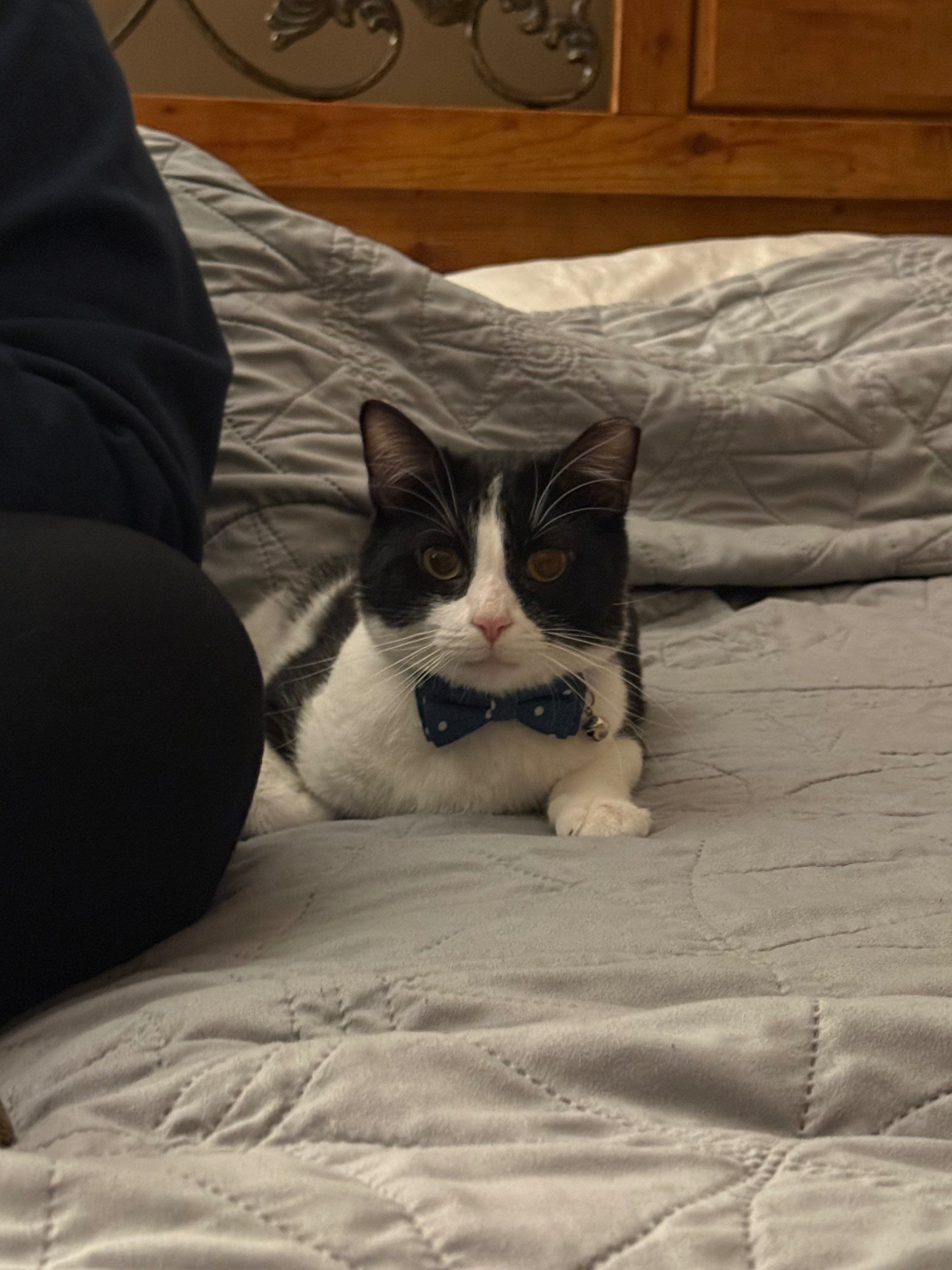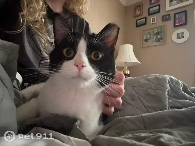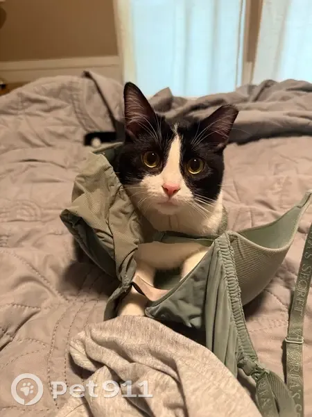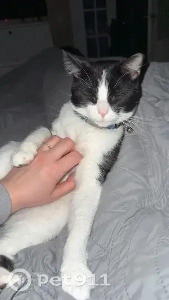Golden eyes, one ear tip is clipped, neutered, both of his front legs are white with a white chest and belly, his back legs are white with one black sock. He has all of his claws. He wears a blue bow tie collar with white polka dots on it but it is a breakaway so it may have fallen off if snagged on something. His collar has his name and my cell phone number on it. We have no clue how he got out, he must have slipped past with people coming in/out of the house. He was caught as a feral kitty when he was young, but since then has been raised as an indoor cat.