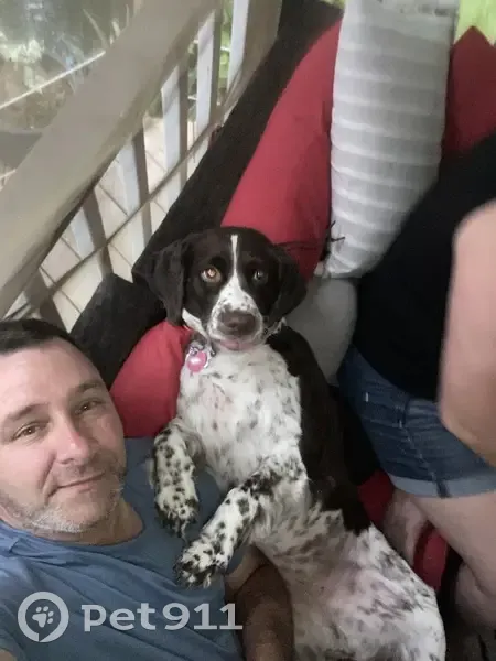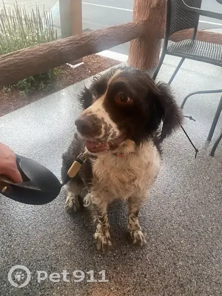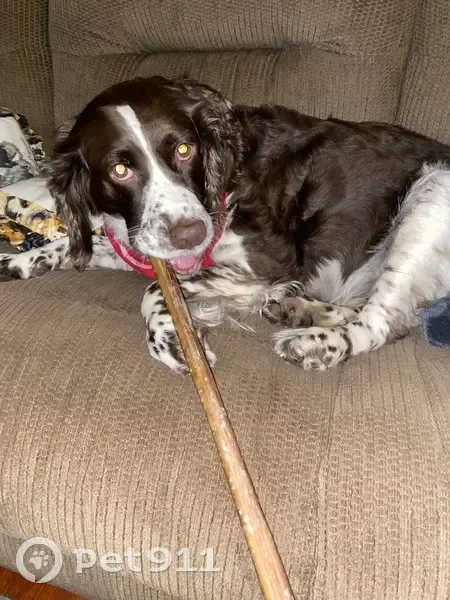 Coat color liver, brown and white springer spaniel, she is about 80 lbs. Will probably bark and snarl when approaching her but she never bit any one. Very fast runner and enjoys hunting and sniffing. I believe she sneaked behind me while carrying large items thru our back door. She disappeared around 9:30 am.