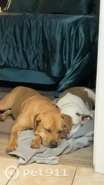 Lilah (brown) has a pink collar on and weighs about 85lbs. Roxie (white and brown) has 2 collars on- one black and one camo. Both female.