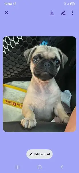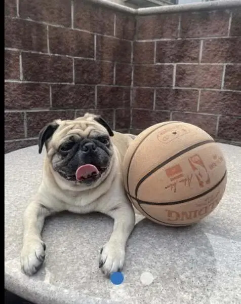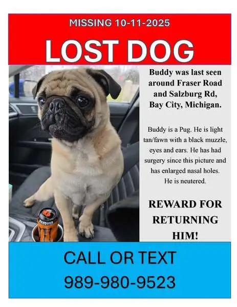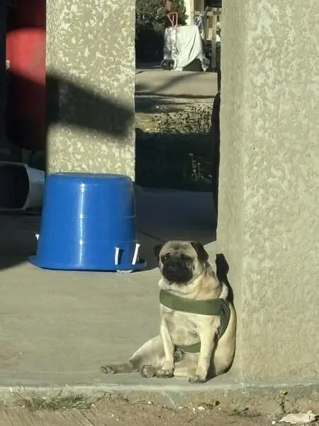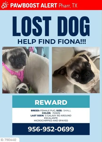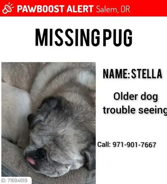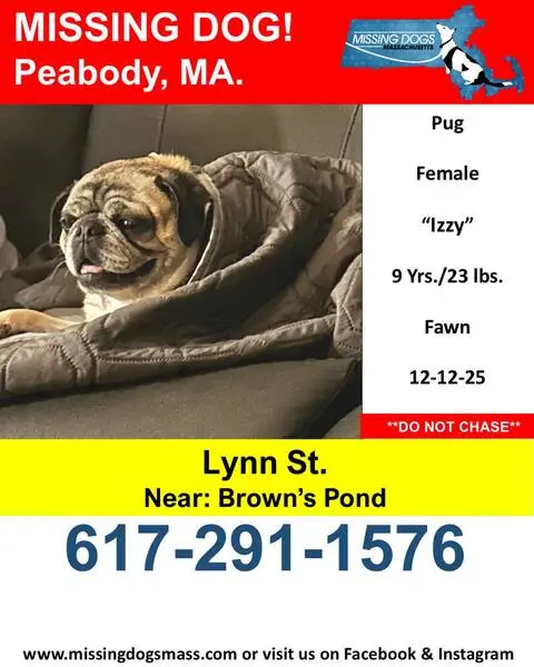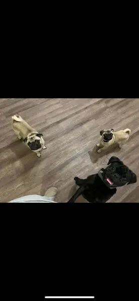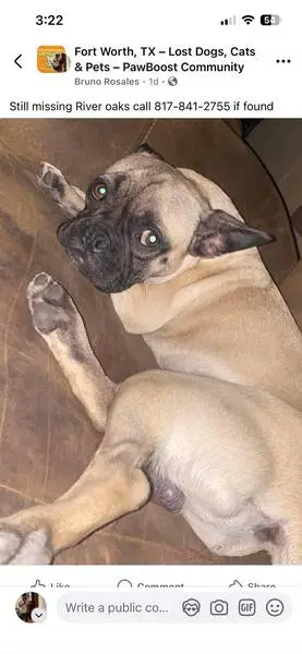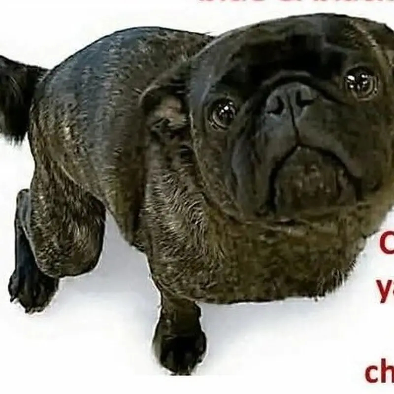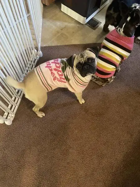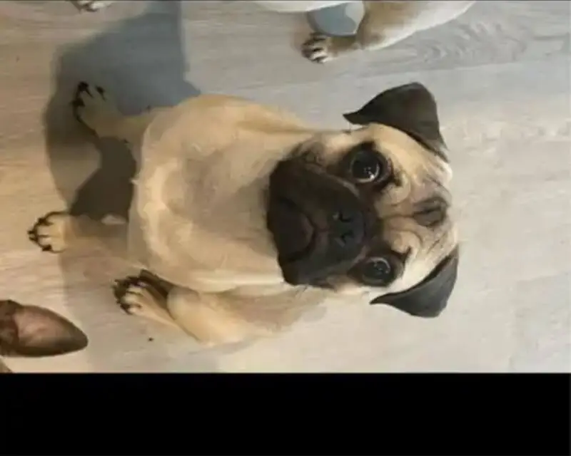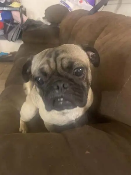 Female pug, super sweet, darker face, small bulge by right hind leg on body, enlarged but not looking like just gave birth teats. She was roaming the neighborhood and stopped when my husband got out of his car and followed him up to our front porch area. We gave her some food and water, and we were able to get her secured in our garage and she is now in a super large crate as we can’t have her around our other dog yet. She is safe, we will be taking her to check for a chip in the am.