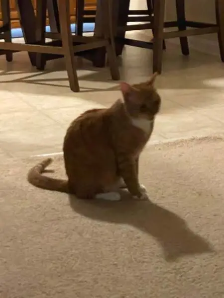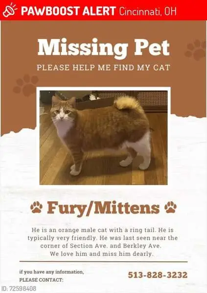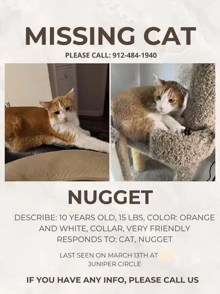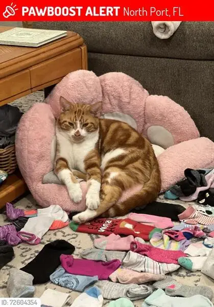 He was found at New Vistas Center for Education. He’s orange & white with smooth short haired fur. He’s very friendly & even has clipped nails on his two front legs. He’s clean & has a small like scratch on his nose that’s healing.
