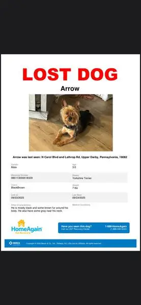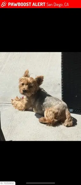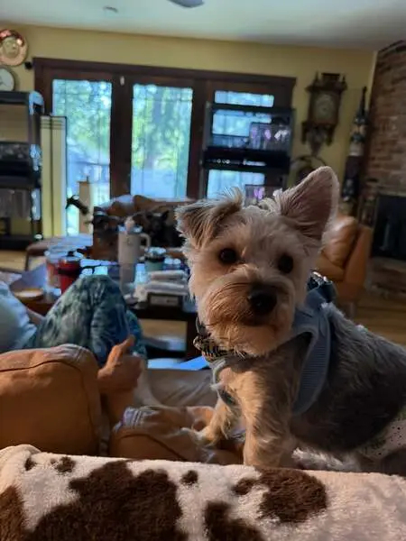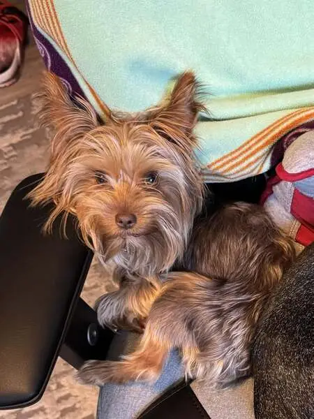 Yorkie older, weighs 4 pounds. Chipped but number not active. She’s approximately 12/14 years old has cataracts & needs dental work. She’s very loving & needs her family.