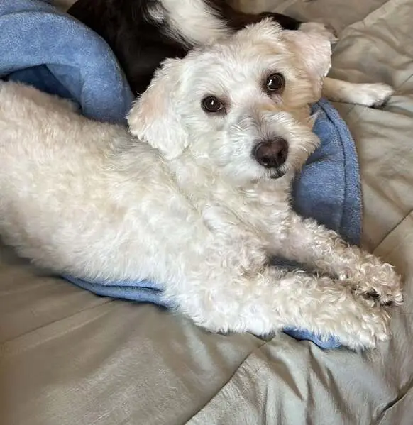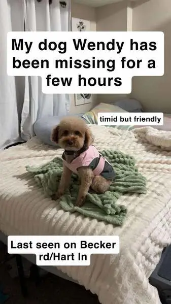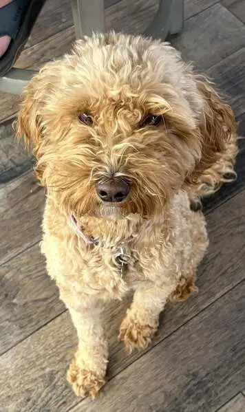 Toy sized cockapoo looking dog. Beige with darker color on legs, feet and ears. Looks like he hasn’t been groomed in a little- skinny in the back and very furry in the head/face. Found with black collar and leash on. Around 9 lbs and estimated to be ~ a year old. Very snuggly and sweet