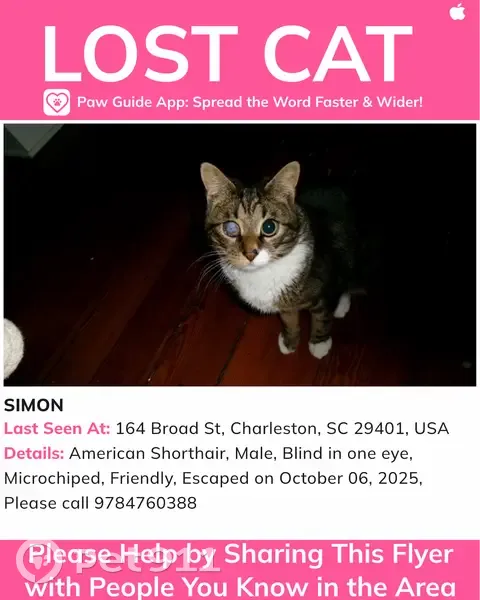 Simon has a black and tan tiger coat, with white back legs and a white patch on his chest. He is blind in one eye and has a lot of scar tissue making it blue/grey. He is an indoor cat so is probably very scared right now, but is very friendly. He's extremely food motivated and loves all wet cat food, fish, bread, cheese, and will do pretty much anything for food.