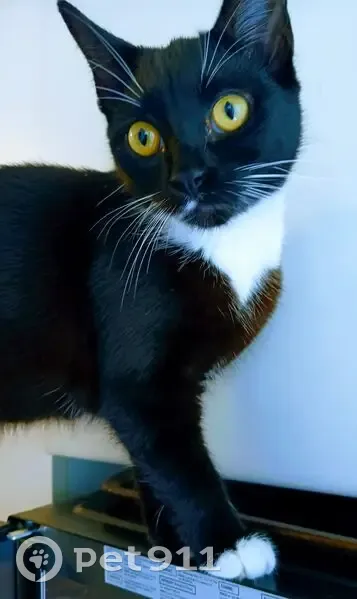 CC is a sleek black-and-white tuxedo cat with striking yellow-gold eyes. Her most defining feature is a prominent white stripe on the upper right side of her mouth, contrasting sharply against her black face. She has a bright white chest and white paws, and she is quite timid, so she is likely to hide or be wary of strangers.