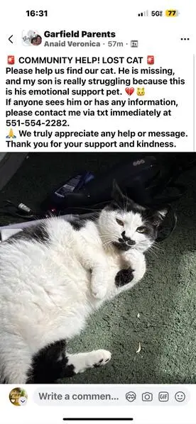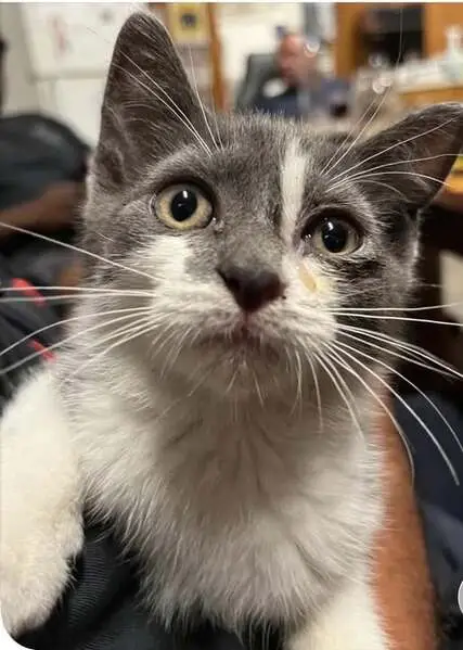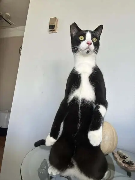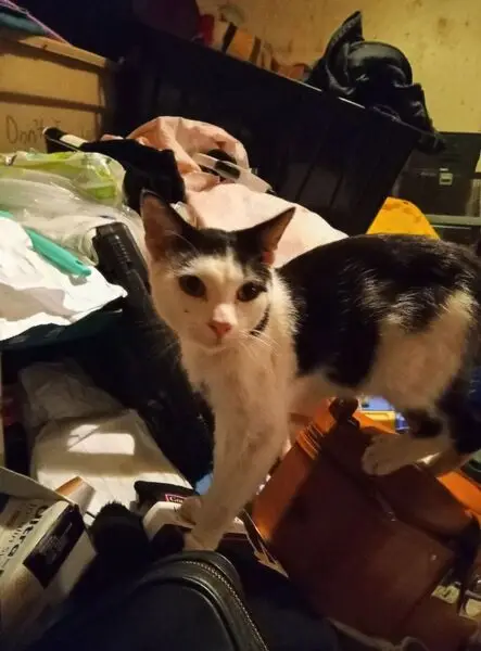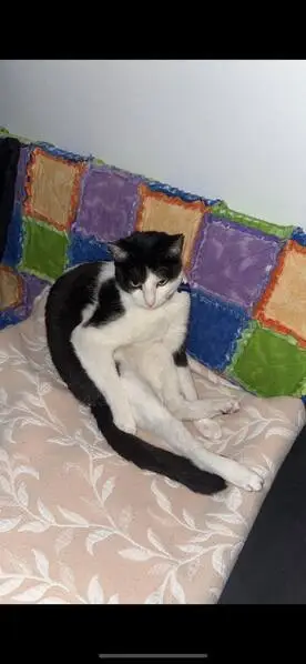 White cat with distinctive black splotches/markings. Multiple circular black splotches on back and left side. Tail is completely black. Black splotches on hindquarters.