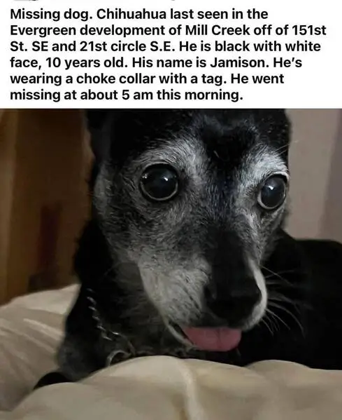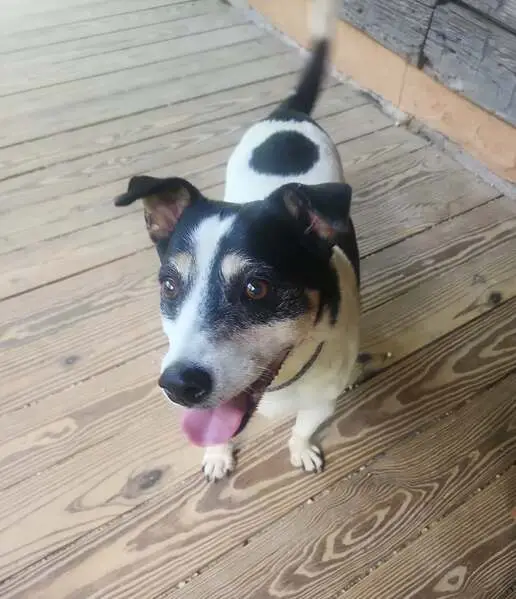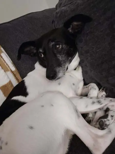 Black and white with salt and pepper patches, especially around the face (he’s a senior). Big ears, white tip on the tail, missing lots of teeth and long toenails.