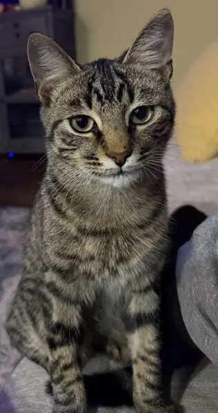 Jimin is a domestic short haired tabby and is mainly black and gray, his belly area is white with some brown, his tail, legs and body are on the smaller side. He has a small brown dot under HIS left eye, and when he stands with his front paws together it looks like he is wearing black arm bands. He was last wearing a purple flea collar and attached to it is a red heart shaped medal name tag with my number on it and a airtag in a green case.