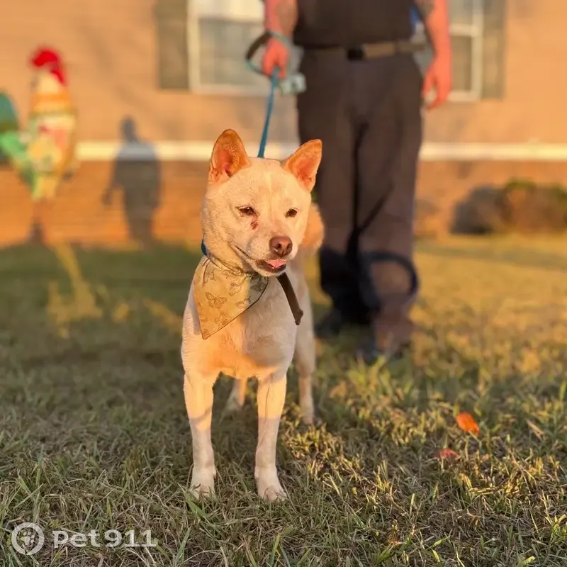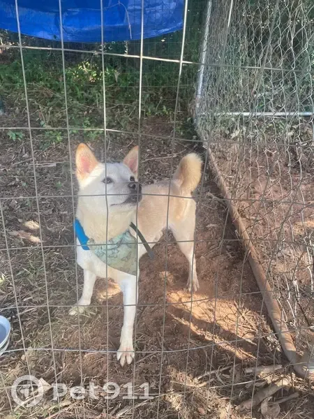 Light beige/some white coat. Small stature, 12-17lbs. Mark under her right eye. Training collar on with a blue bandana. She was in an outside lot and dug under the fence, probably covered in mud