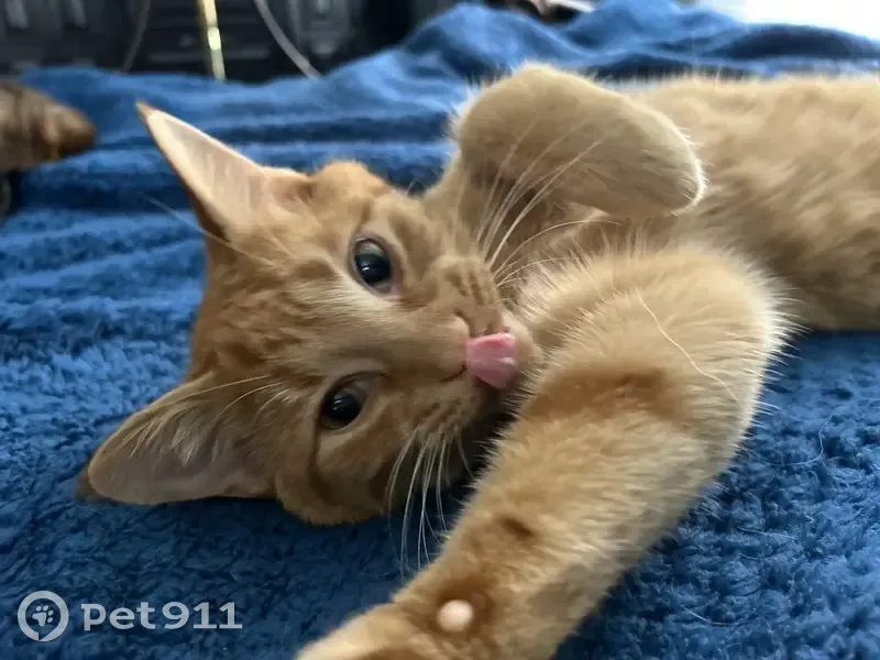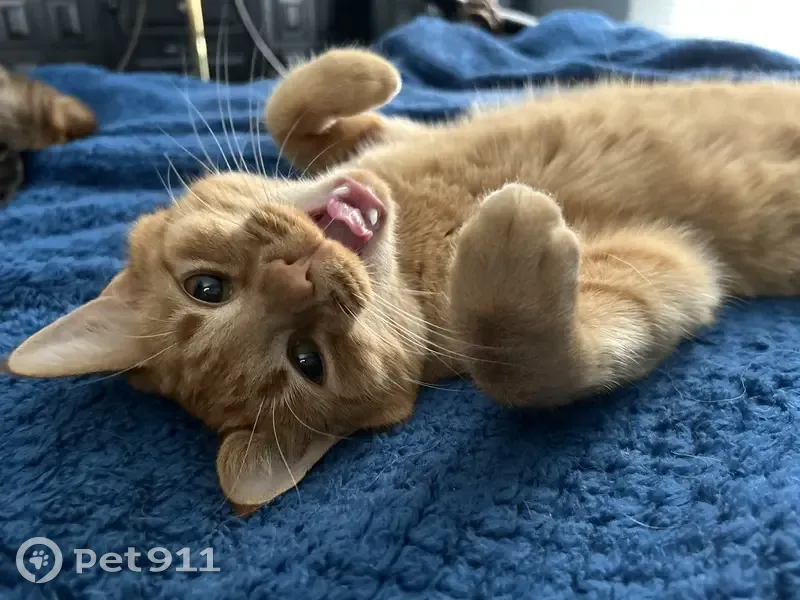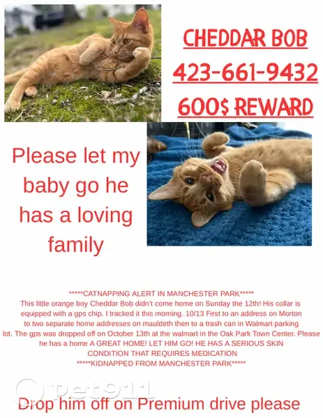 This is a very loved missing orange butt boy. He has white cheeks and a white spot on his belly. The tip is his tail is also white and he has a freckle on his bottom eyelid. He is very very sweet neutered and microchipped. He was stolen from my house and I tracked his gps and harness to the trashcan at Walmart.