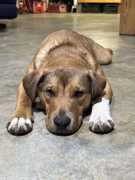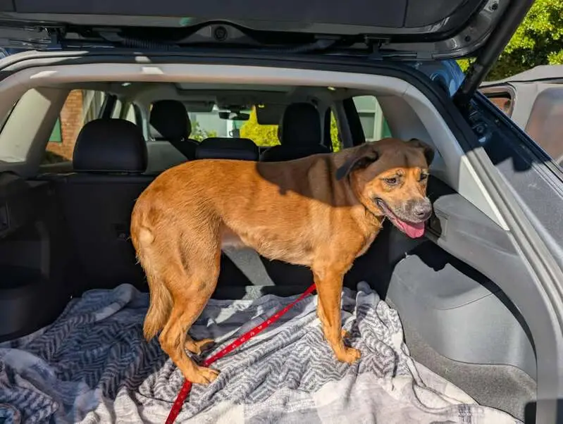 Brown 40lb mixed breed senior dog with a graying face. She dug out under my fence in the backyard. Very skittish. Try and lure her with food or try and get her in your car. Do not chase.