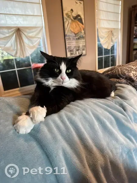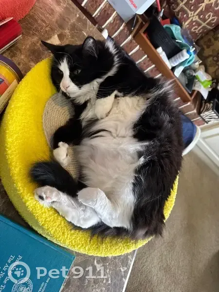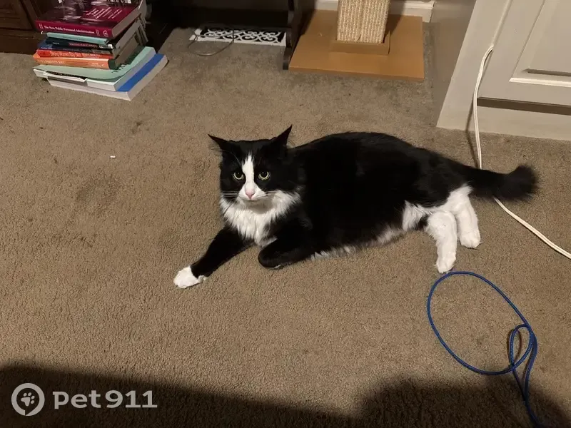 Long hair black and white tuxedo cat. About 15 pounds. His name is Magic. He is about 5 years old and has never gotten outside before. He was wearing a collar with my phone number.