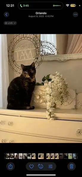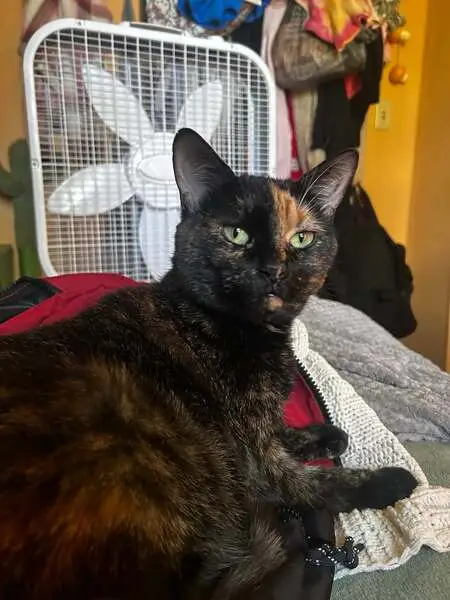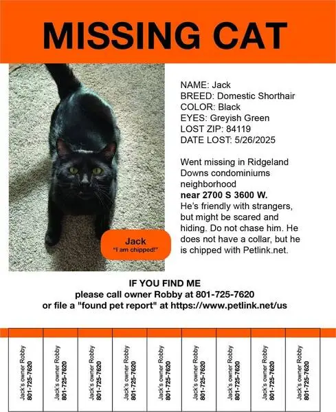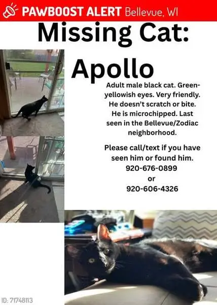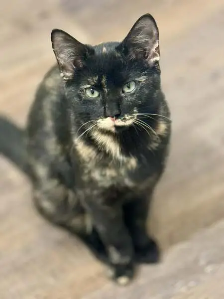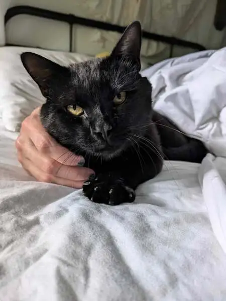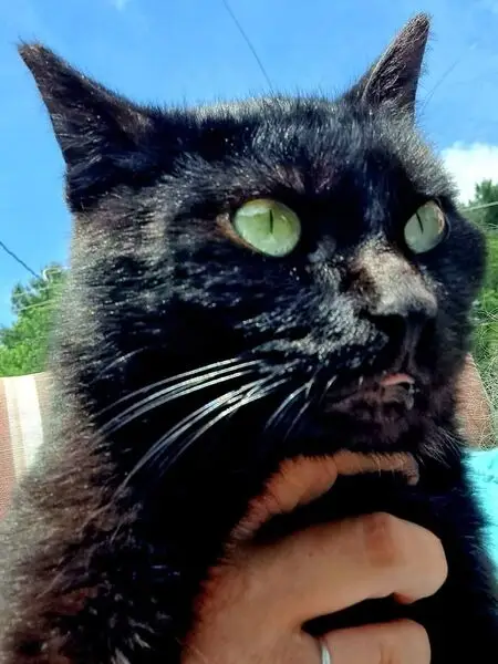 Medium-length black silky fur, bright yellow eyes, small wound and some balding around the neck in place of where a collar would be. Very sweet.