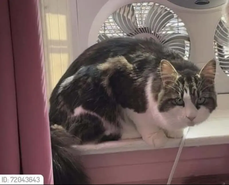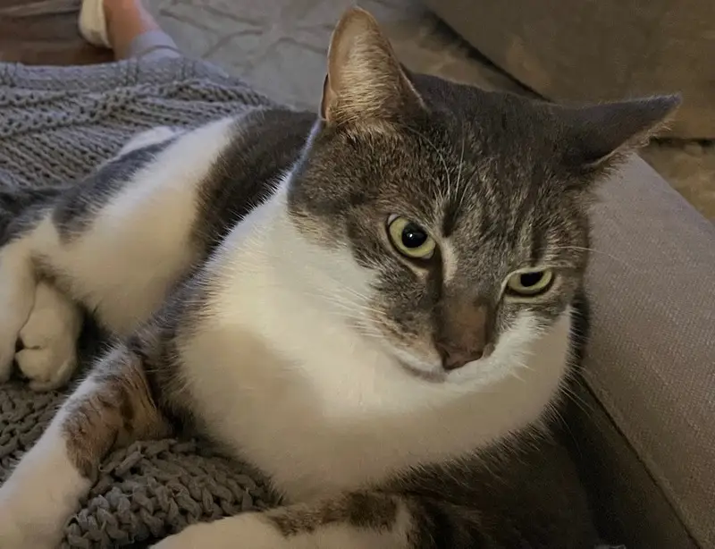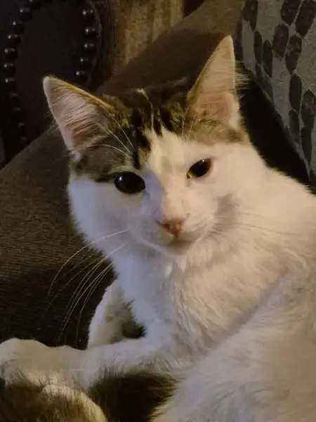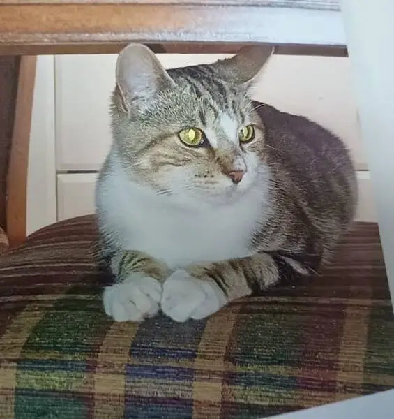Male tabby with half white face and white legs. Has a blue collar with no tags. Found on a walk with the dog, very friendly, followed us a little bit. Very friendly, none of the neighbors outside recognized him