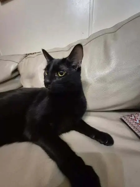 She is an all black cat, save for a small tuft of white hair on her collar and a white spot at the tip of her tail. Her eyes are bright orange as well. I found her next to the wilson red line stop.