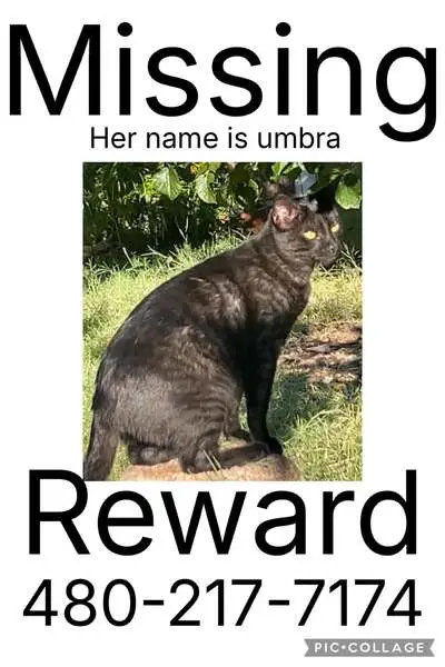 Black with a white Diamond of white on her chest. Green harness also a leash but not sure the leash is still on her. She is chipped and ear is clipped.