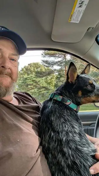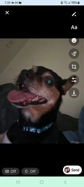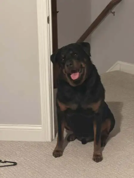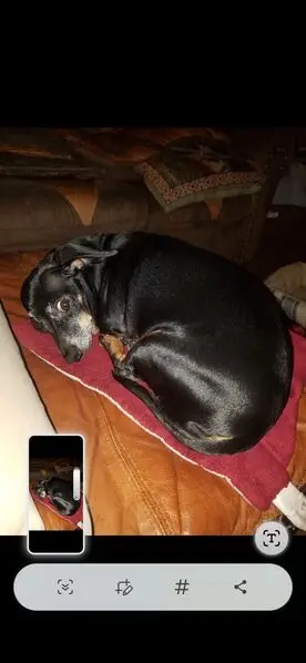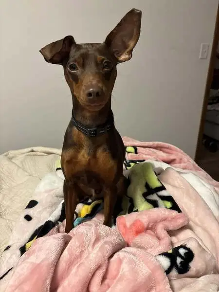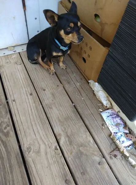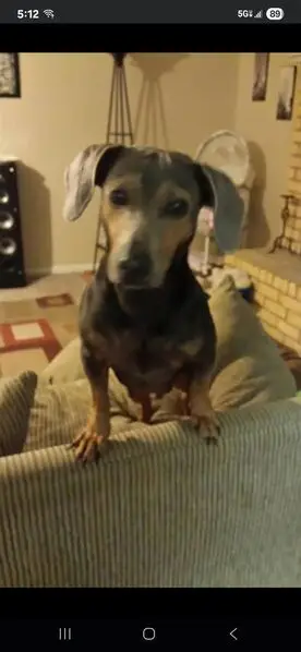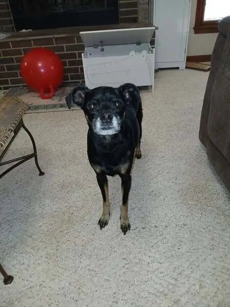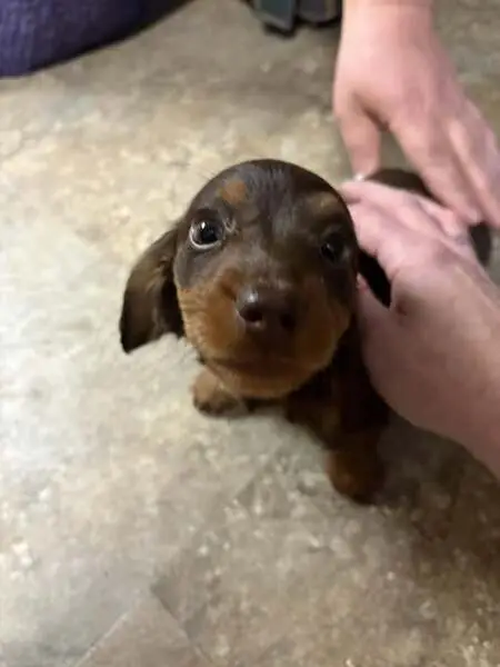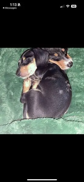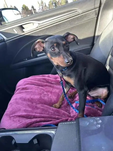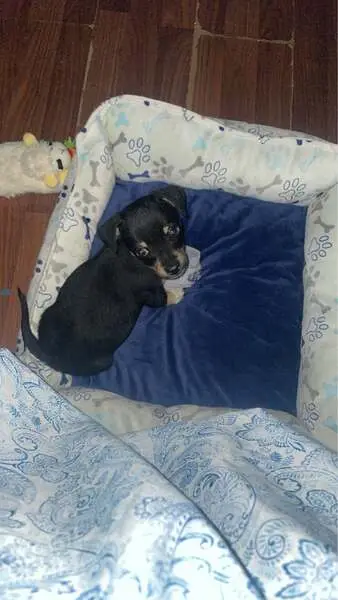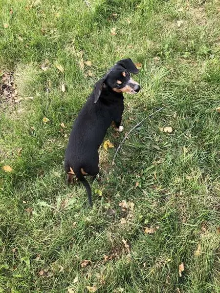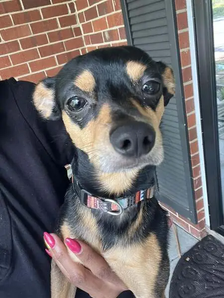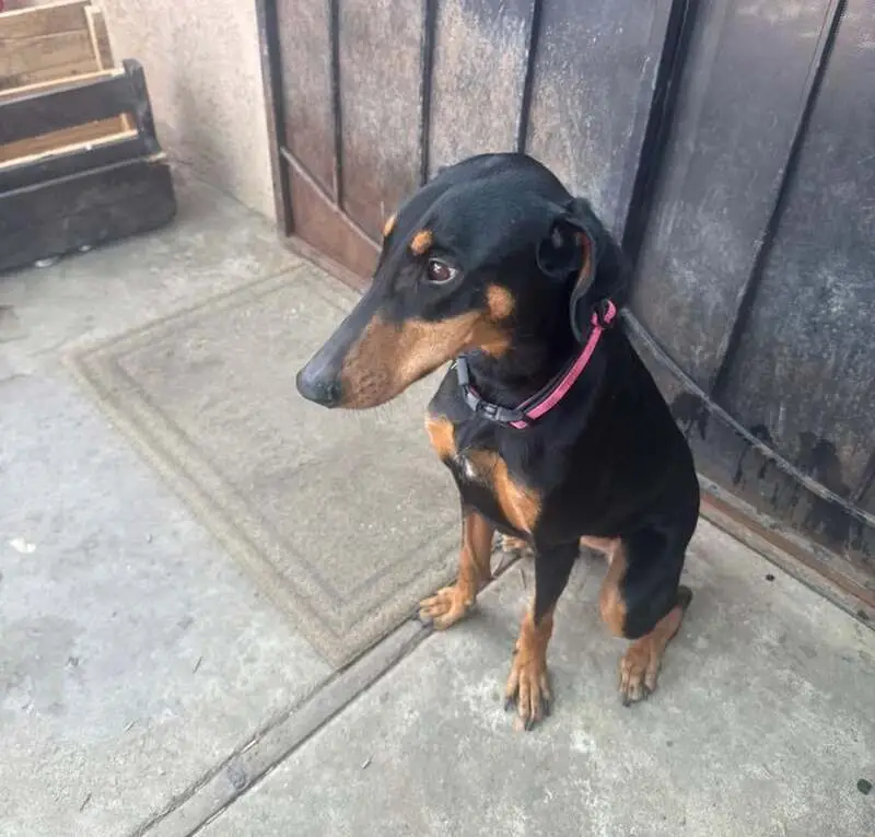 He is black and tan, Doxi-Pin, about 1 year old or less. He is very handsome and kind of shy but a very cool dog. He was found lying down outside in front of an apartment building, in the sun looking dehydrated and exhausted. He had no collar on. I brought him in and will keep him until I find his owners.