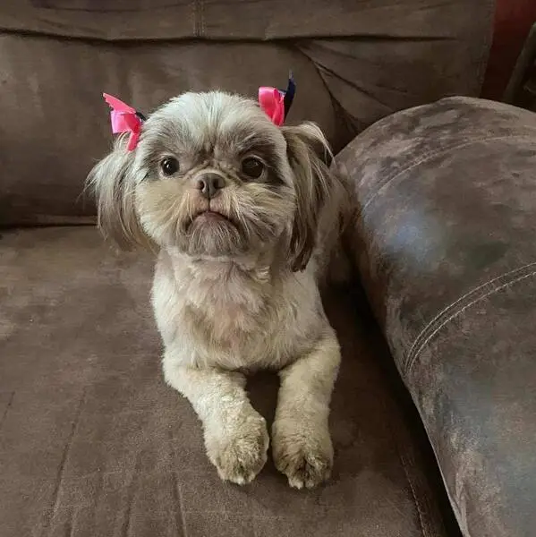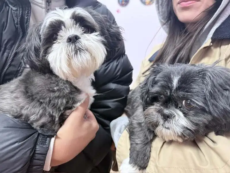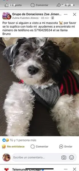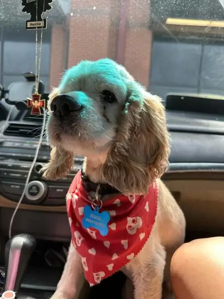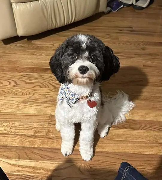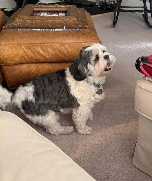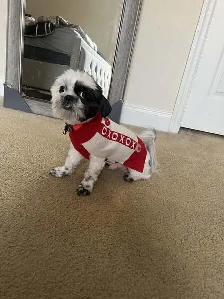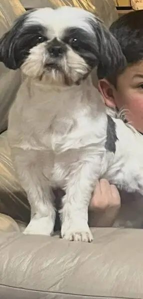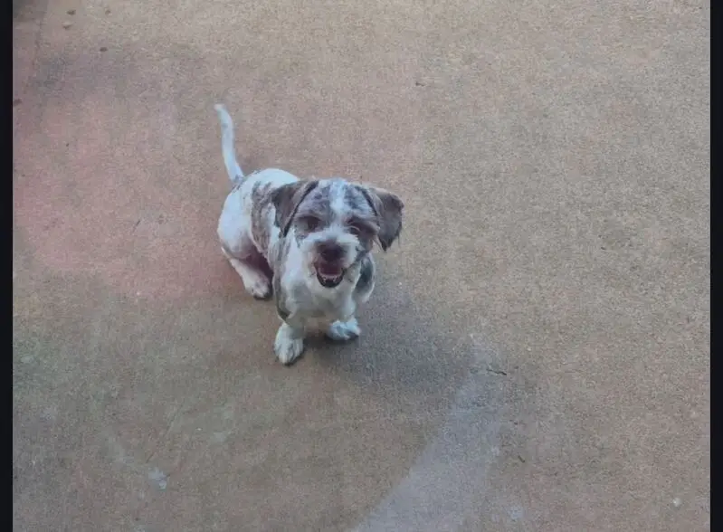 Small dog with Black and white spots, big brown eyes, and droopy ears. No collar. Long tail with white and black spots. Dog is friendly and spins in circles when he gets excited.