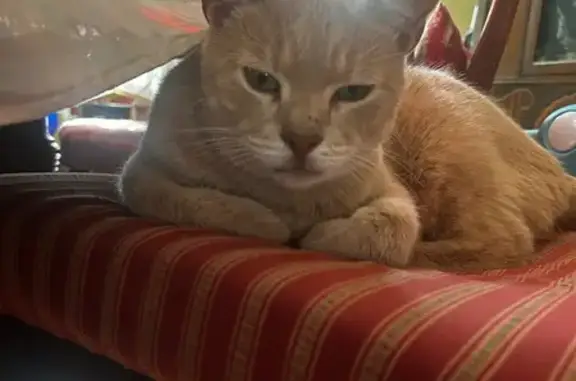 Frazier, a ginger cat, orange with stripes. He slippped out of the storm door which was not completely latched, jumped off the porch and ran as fast as he could into the woods behind my house. He is an inside cat and does not go out. He’s shy. If people come to visit, he runs and hides under the bed for hours.