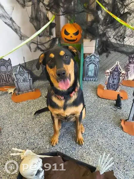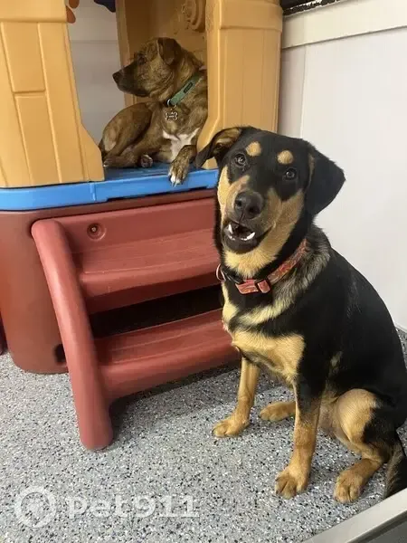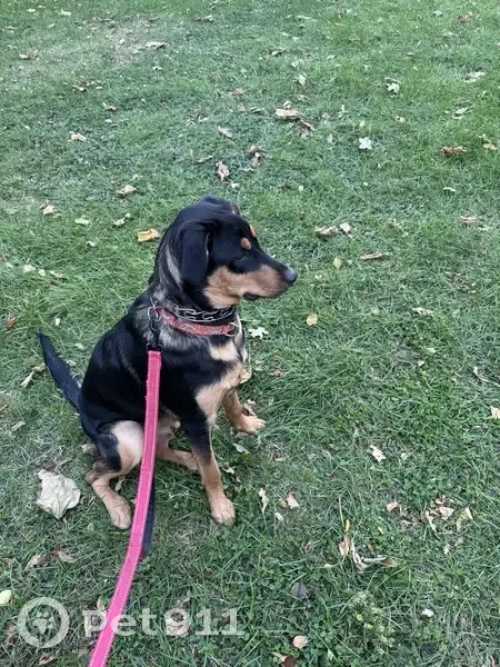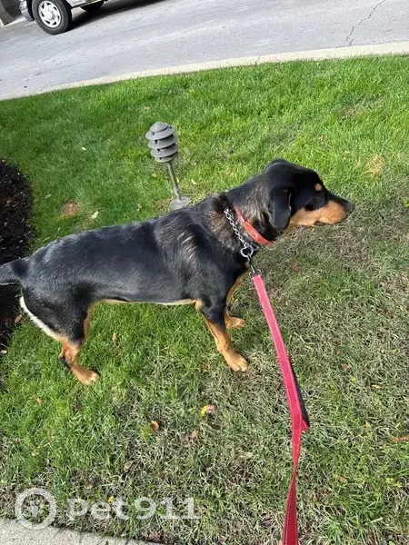 Dub has a black and tan coat. He’s 8 months old and weighs 60 pounds. He’s a Labrador Doberman mix. He was wearing two collars. One was red and the other one was a silver prongs collar. His red leash was still attached to him.