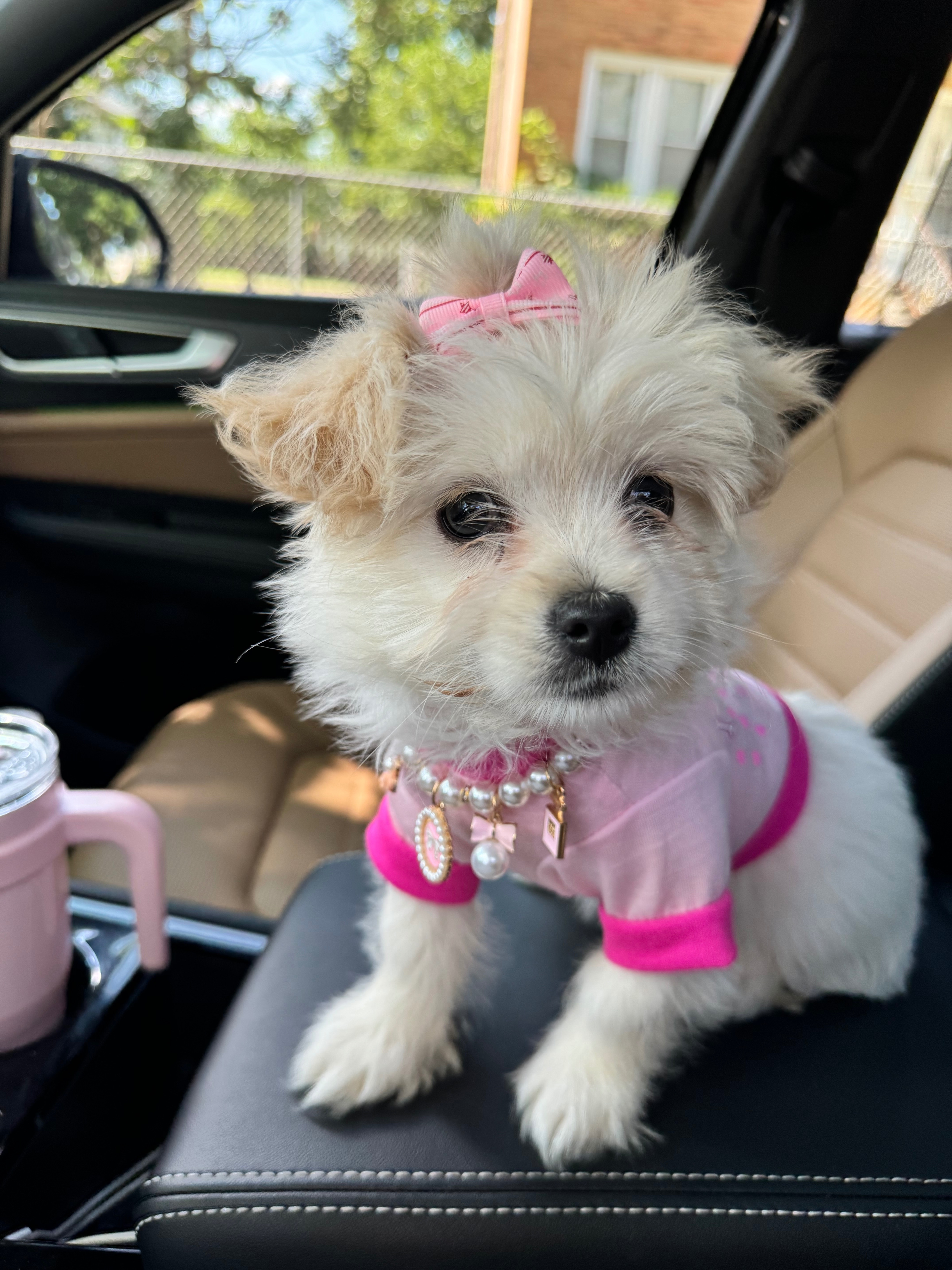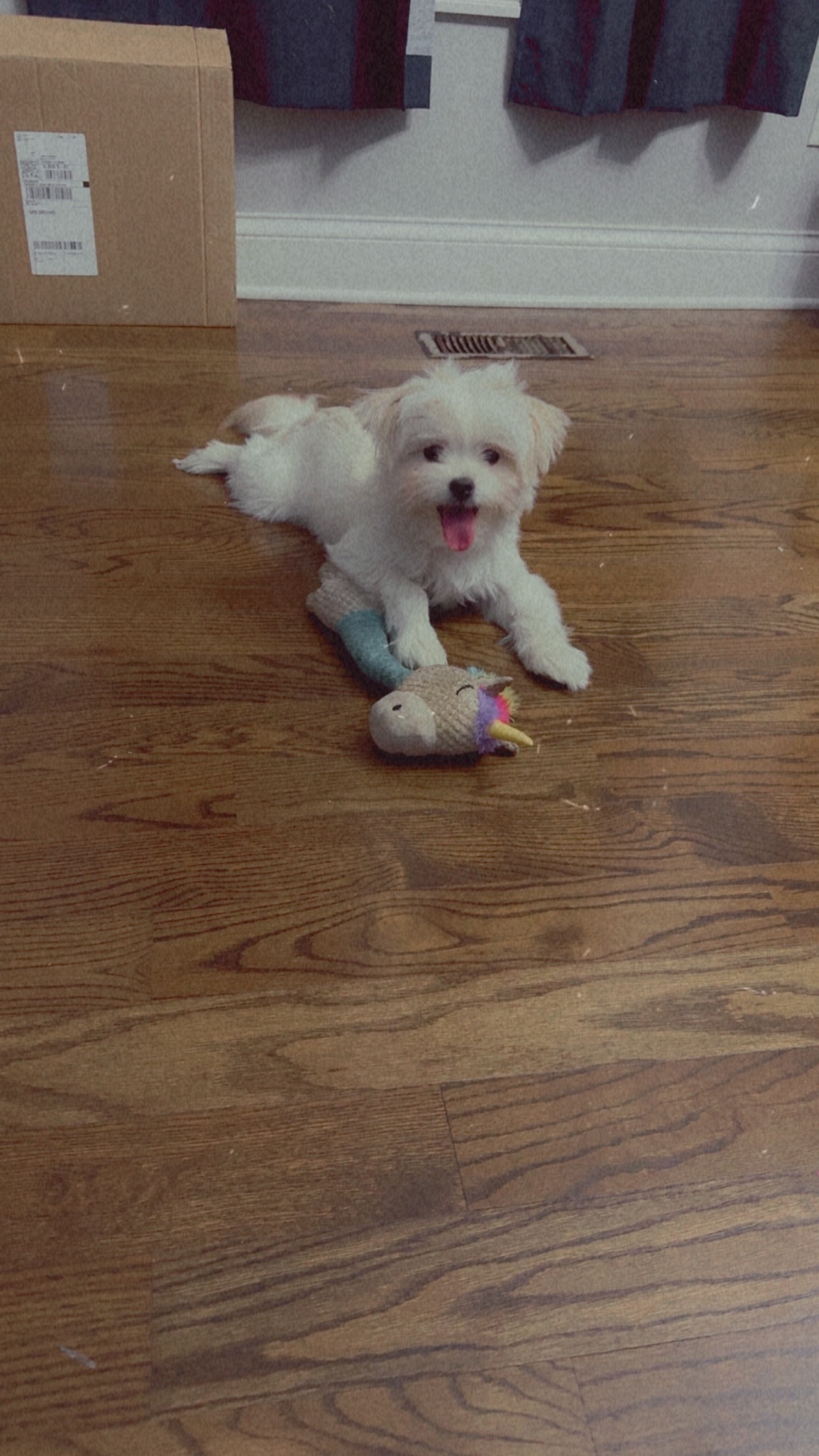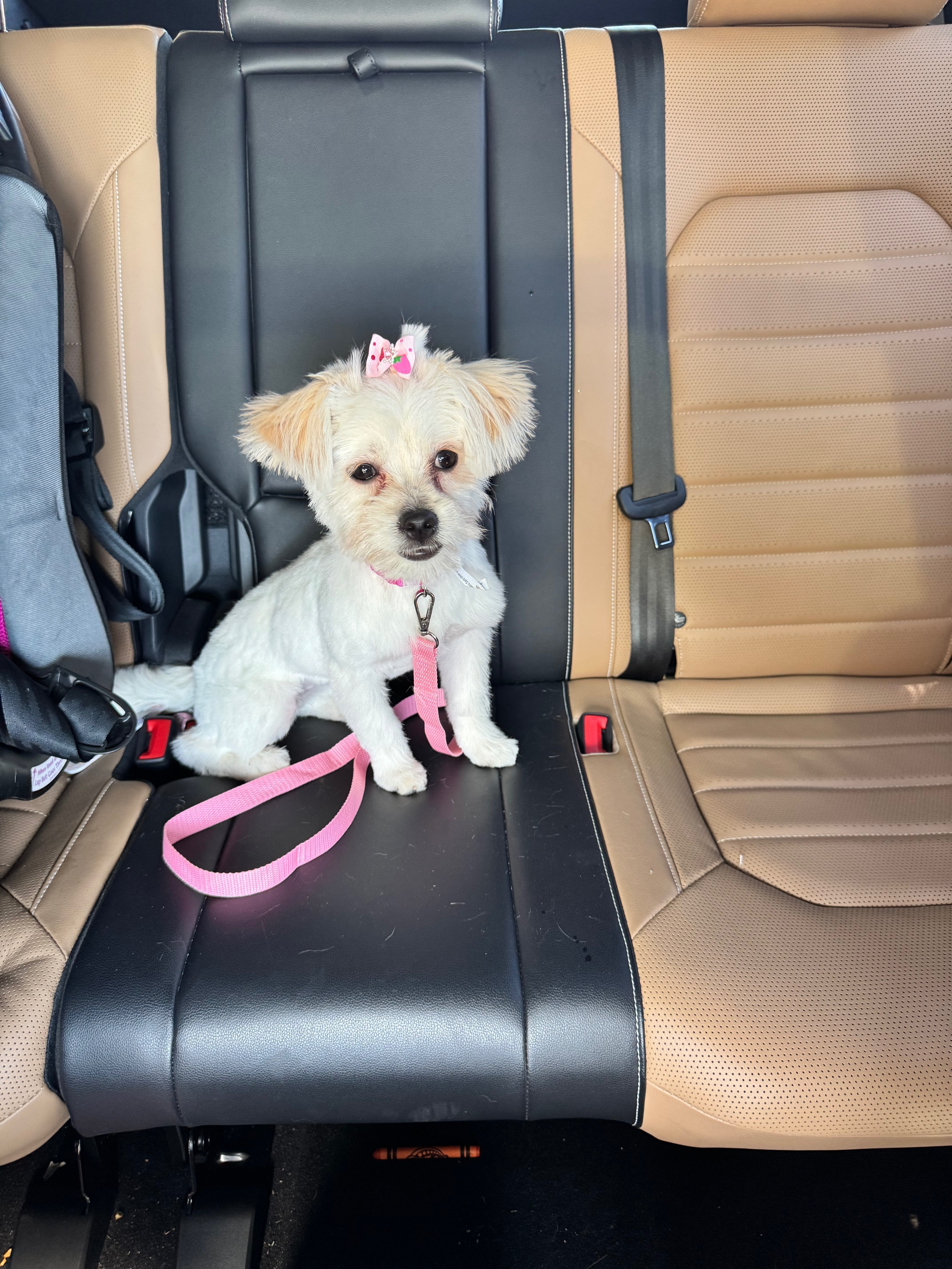 She has a White coat pink collar, her name and my telephone number is listed on her collar. She is very friendly, she has really bad anxiety. She’s only 1 years old and has a brown strip on her under belly.