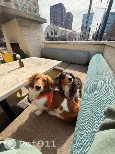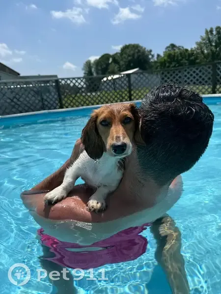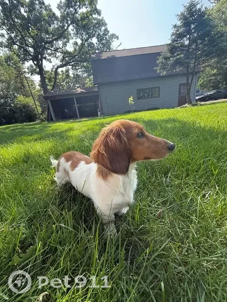 Mo is a small brown and white mini dachshund he is wearing a red parka. He’s a little skittish towards bigger dogs so please do not try to chase him. Please call me at 630-388-8617.