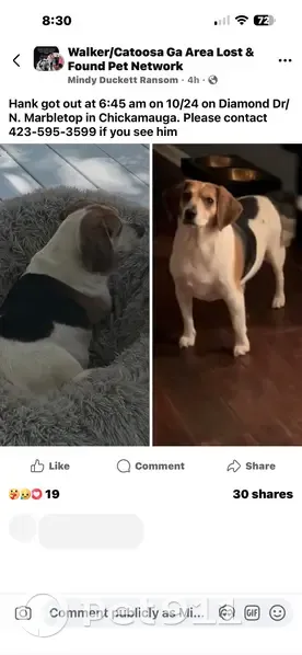Hank is a five year old beagle. His face has a little grey on it. He sometimes limps on his back leg. My daughter left for work at 6:45 am on 10/24/25. The door didn’t shut all the way and he got out. We have searched the woods on our street and have checked the animal shelter with no luck.